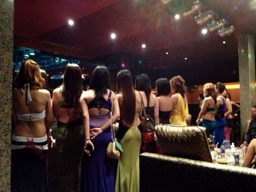 部屋に連れていく前に、上の写真のように席に呼んで、親しくお話をして、良い子かどうか、服の上から乳、お尻、腰部などを触って具合を確認する。キスしたり、マンコも触ったりすることもある。こちらのチンコが固くなってるのもさわらせる。