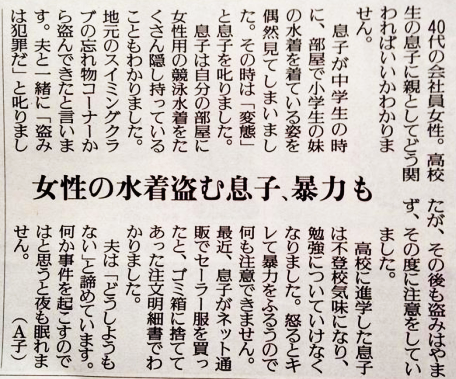 息子が中学生の時に、部屋で妹の水着を着ている姿を偶然見てしまいました。
