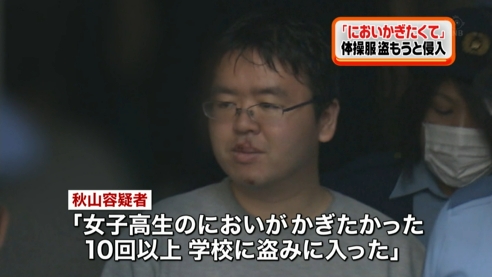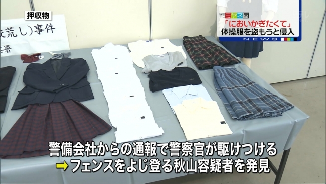 プログラマーの男は13日午前0時すぎ、府中市の高校に侵入し、女子高校生の体操服や靴下など8点を盗んだ疑いが持たれています。警視庁によりますと、 「何者かが高校の中に侵入した」という警備会社からの通報を受け、警察官が駆け付けたところ、男が高校の敷地の外に出るため、フェンスを乗り越えようとし ていたということです。取り調べに対し、男は「女子高校生の体からにじみ出るにおいを嗅ぎたかった」と容疑を認めています。男の自宅からは、体操服のほ か、制服など40点以上が見つかっていて、警視庁は、東京や神奈川の中学校や高校で犯行を繰り返していたとみて調べています。